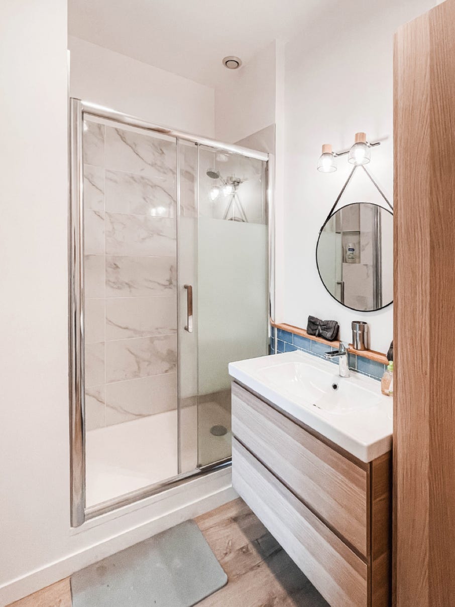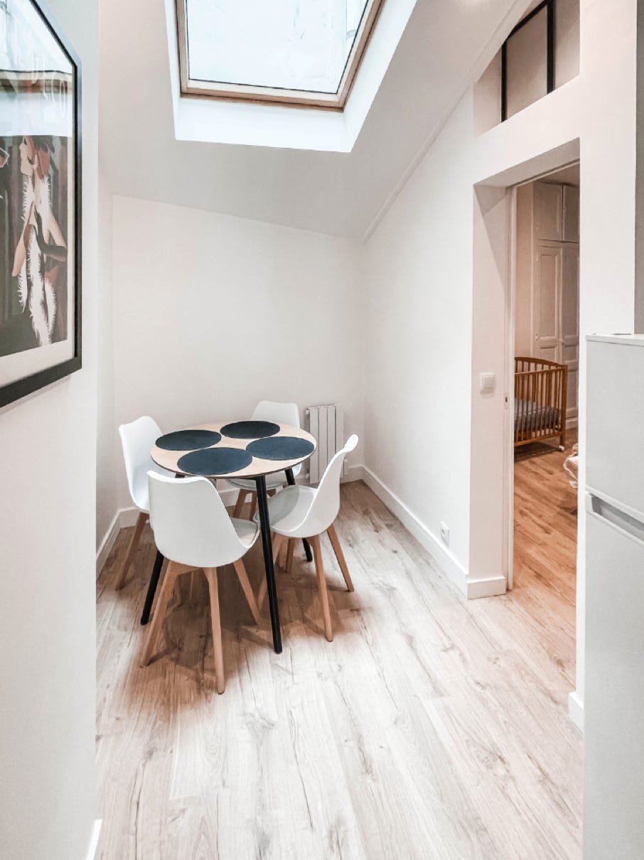 S’il avait le charme de l’ancien avec son mur en pierre, cet appartement de près de 75 m² ne disposait que d’une chambre, éclairée en second jour qui plus est. Afin d’optimiser l’espace et qu’il dispose d’un maximum de couchages, nous avons donc créé une seconde chambre en divisant l’ancien double séjour en deux. La cloison de la chambre existante a été, elle, déposée et remplacée par des verrières en verre sablé, toute hauteur, afin d’apporter à la fois lumière et intimité. La cuisine a également été optimisée puisque la longueur de plan de travail a été multipliée par deux par rapport à l’existant, grâce à un double linéaire de rangement de 40 et 60 cm de profondeur. C’est un modèle IKEA, à la fois économique et esthétique.