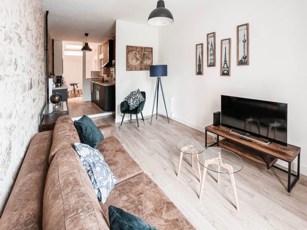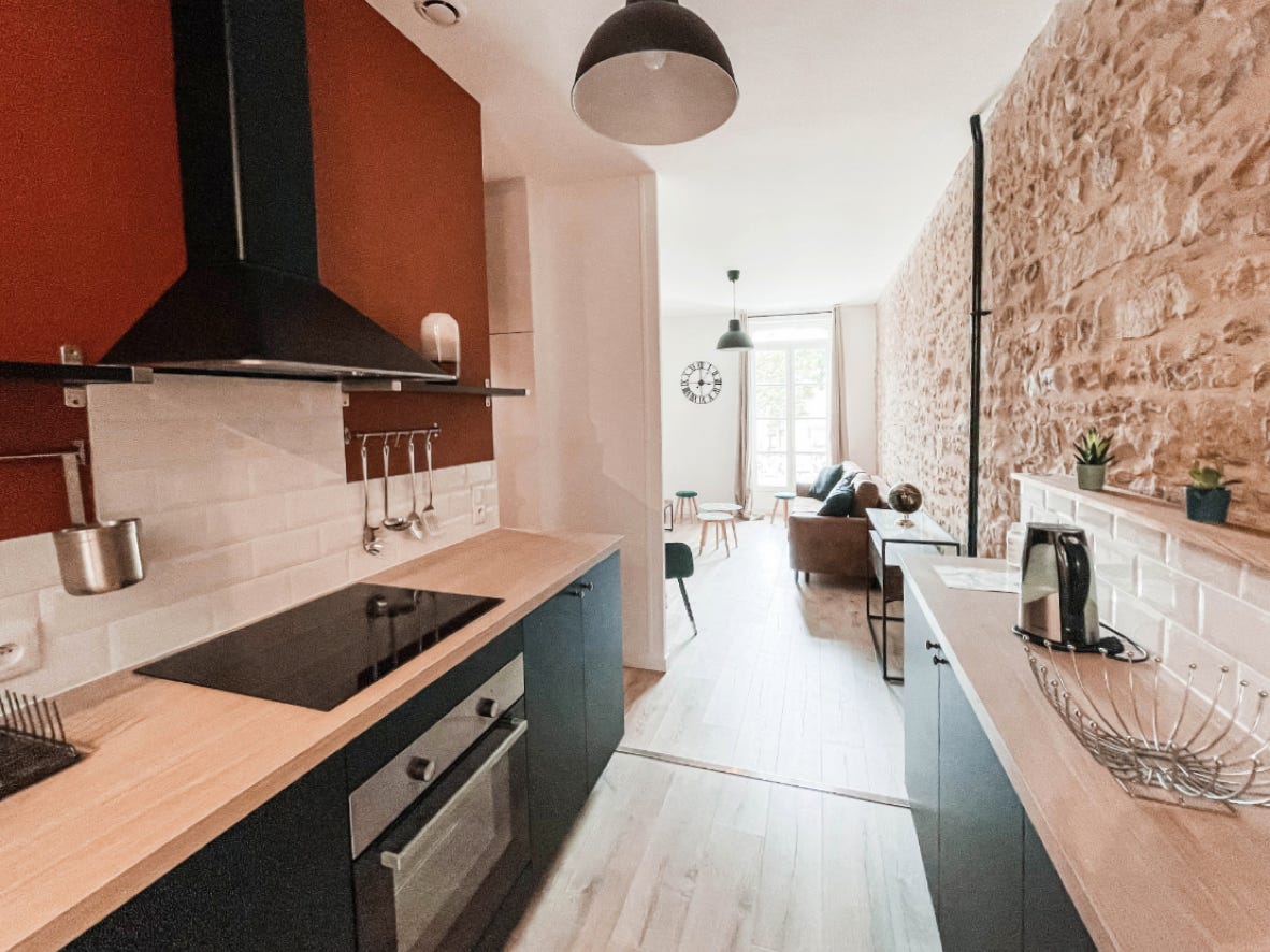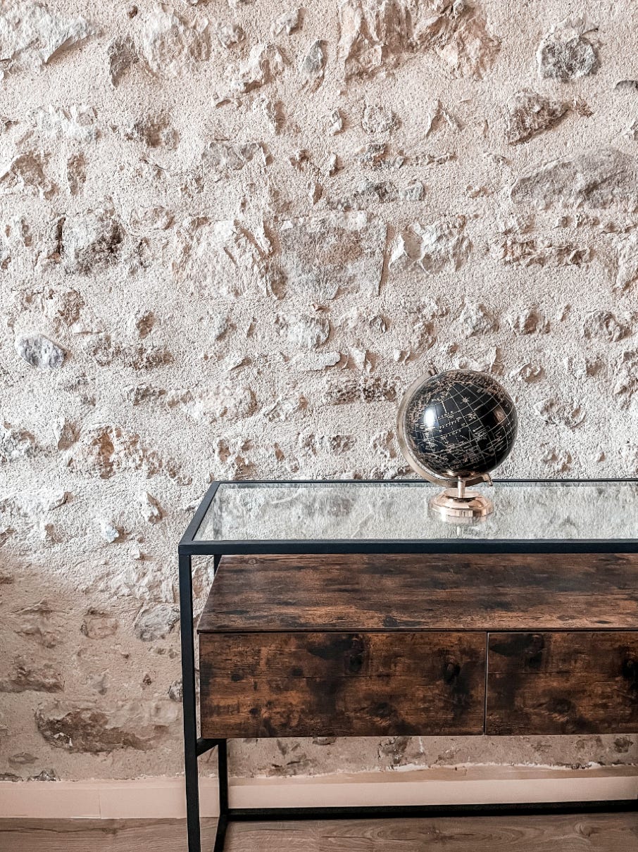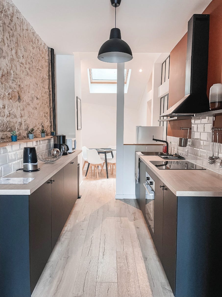 Comme cet appartement était destiné à la location, il fallait que les photographies, donc sa décoration, accrochent l’oeil. Nous avons proposé un style industriel, à la fois photogénique et dans l’air du temps. Au beau mur en pierre, répondent les couleurs et les matériaux typiques de ce style : parquet et plan de travail imitation bois, suspensions en métal noir, cuir synthétique, carreaux «métro» en faïence blanche, et murs terracotta.